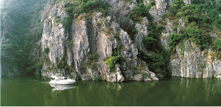 乘坐在快艇上乘風(fēng)破浪,在江面上疾馳,兩岸的青山巍峨聳立,偶有成群的白鷺在江面上拍著翅膀飛過,不遠(yuǎn)處還有農(nóng)舍、田園,眼前的景色就像一幅優(yōu)美的山水畫。唐代名相張九齡就在其詩作《湞陽峽》中寫道:“行舟傍越岑,窈窕越溪深。水暗先秋冷,山晴當(dāng)晝陰”,表現(xiàn)了峽谷的幽深。即將開通的廣樂高速,也有架橋在江面上經(jīng)過,那巨大高聳的橋梁,本身也是一景,F(xiàn)代化的橋梁與古樸的江景相映成趣,“一橋飛架南北”的景觀讓人嘆為觀止。景區(qū)所提供的快艇也是全新的,里面電視、音響、洗手間、酒吧等一應(yīng)俱全,與友人在這里一邊品茶一邊欣賞兩岸景色,美哉快哉!